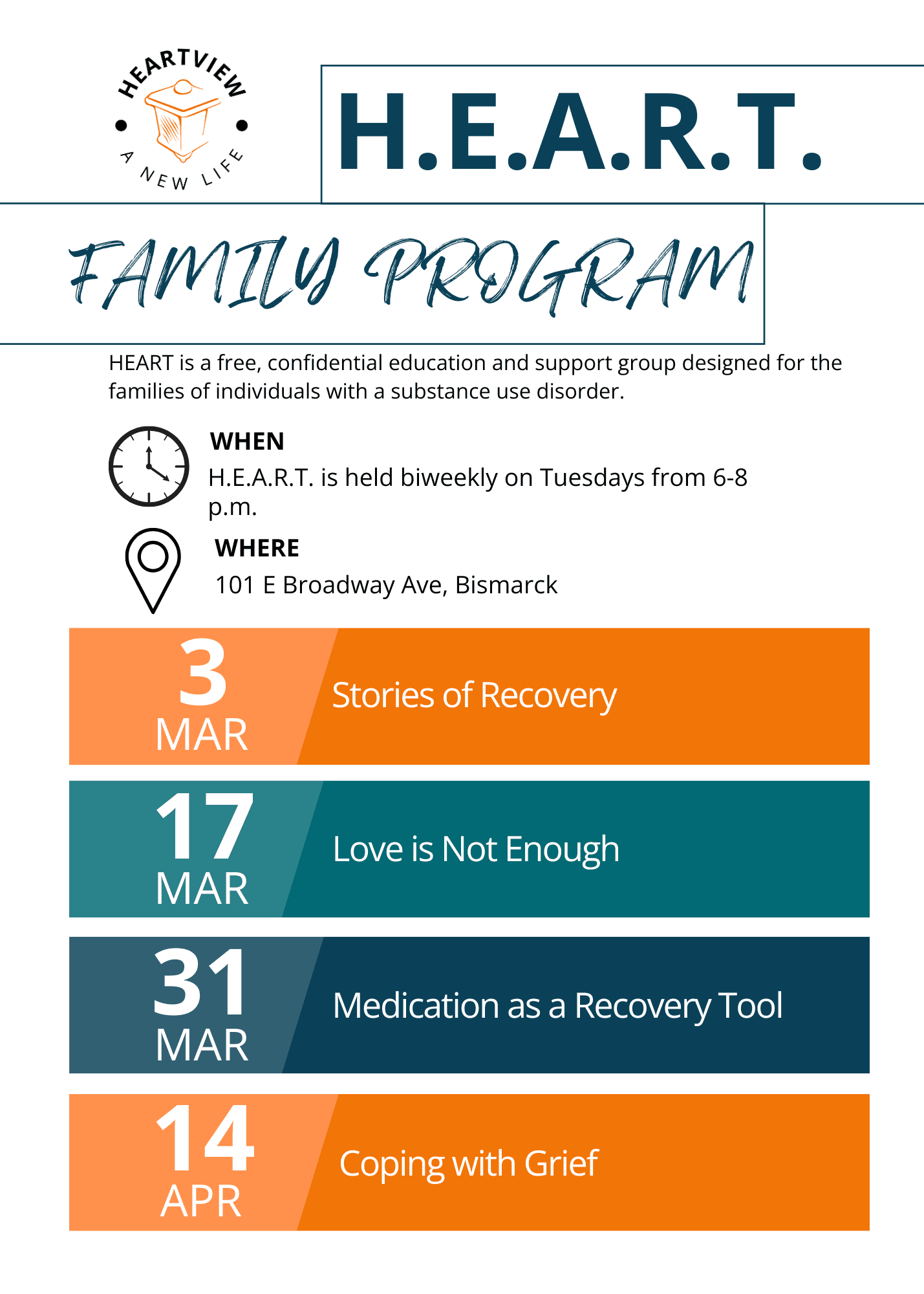 H.E.A.R.T. (Helping Everyone Achieve Recovery Today) is a confidential education and support group designed for the families of individuals with a substance use disorder. The purpose of H.E.A.R.T. is to enhance the knowledge and skills of families as they journey through addiction and recovery.